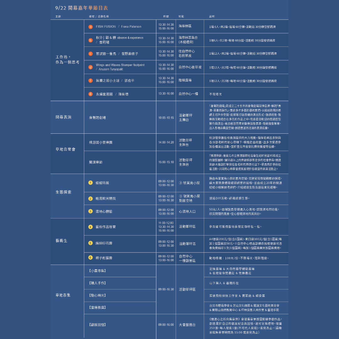 • 內容:開幕表演、草地市集、藝術家工作坊、藝術作品導覽、創意生活手作、生態探索體驗、蛙蛙特展、集章活動、藝術季拍貼機