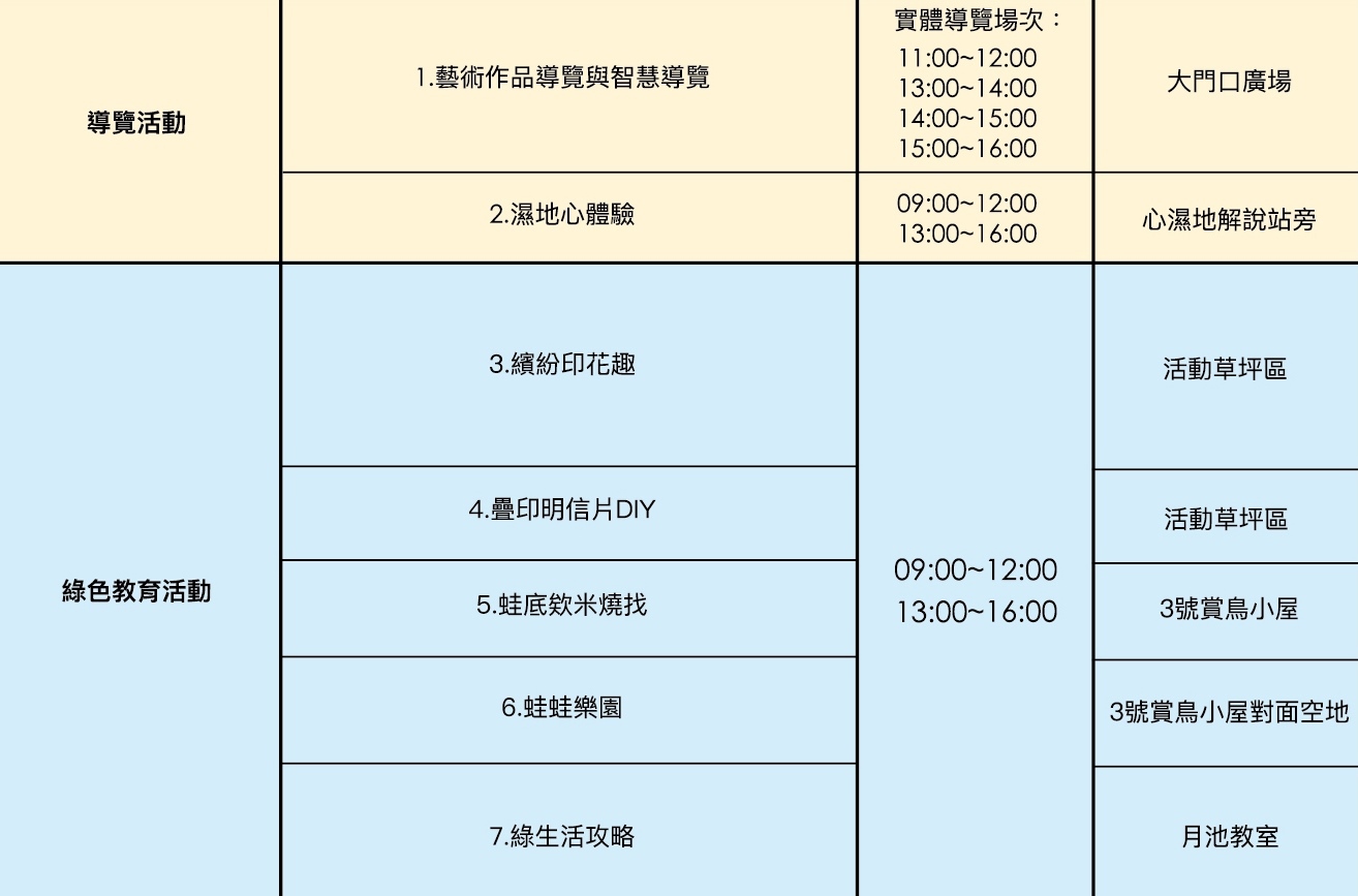 • 時間:09:00 - 16:00(16:00活動攤位結束)(18:00自然中心閉館)(18:30園區閉園)