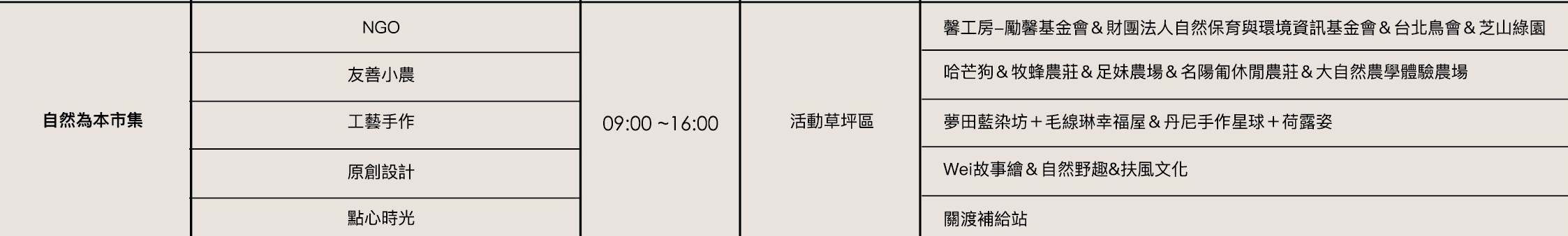 •  自然為本市集|結合環境友善理念與在地特色品牌,帶來兼具永續與創意的特色商品市集。