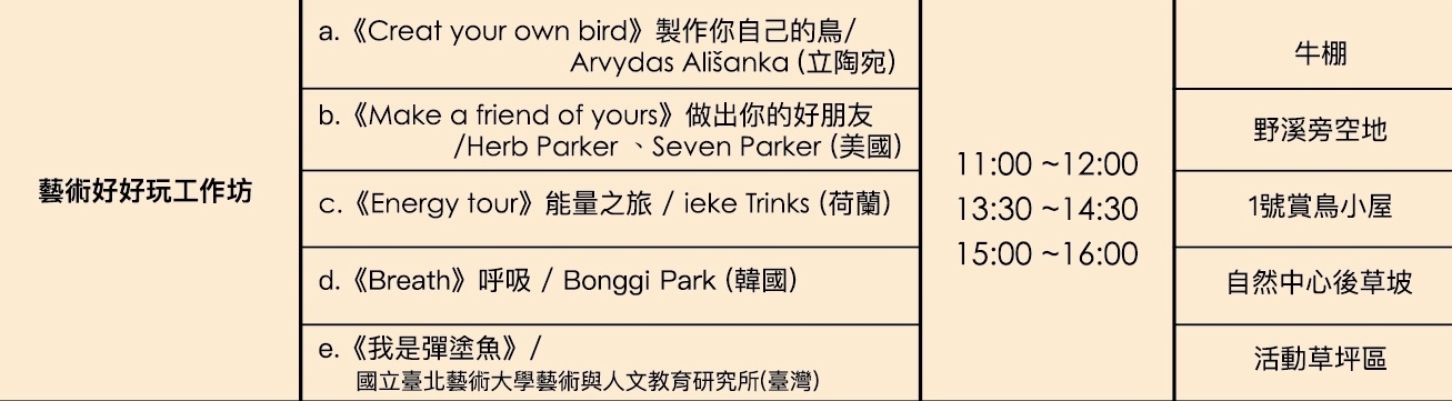 •  藝術好好玩工作坊|適合大小朋友參與的自然藝術體驗,一起動手創作,感受藝術與生態的連結。活動前30分鐘於各站發放碼牌。